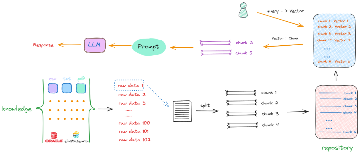 在构建索引阶段, 我们把结构化的数据转化大模型能识别的向量格式进行存储, 能借助向量数据库高效模糊匹配检索的方式, 非常快速的在庞大的chunk群中检索出最相关的.