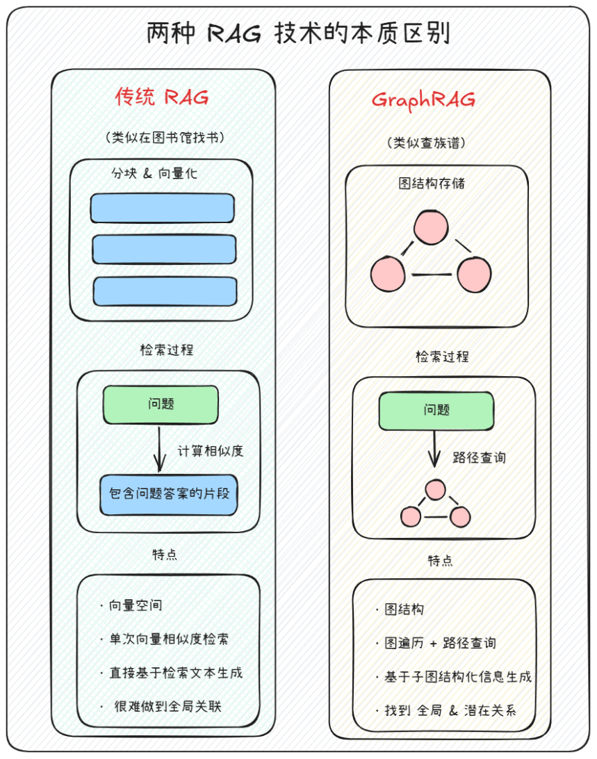 对于GraphRAG, 不是吧传统语义且分成一个个小块存储, 而是将实体关系以图的形式进行存储. 变成了要做一个路径的查询. 变成了基于子图的结构化信息进行一个最终的回复.
