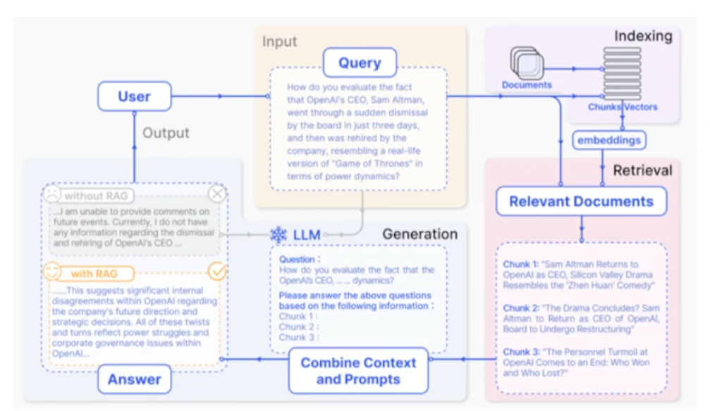 - 流程:文档预处理 → 分块 → Embedding → 存入向量数据库 → 检索与生成
